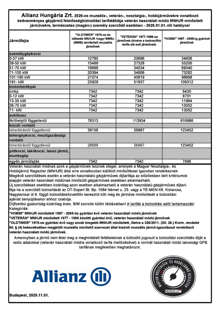 A biztosítók közzétették a 2026. évi, veteránjárművekre vonatkozó tarifáikat. Amennyiben az alábbi mellékletekben kedvezőbb ajánlatot talál a jelenlegi biztosításánál és váltani szeretne, akkor december 31-i évforduló esetén 2025 november 30-ig, illetve a biztosítás évfordulóját megelőző 60-30 napig a lenti letölthető felmondási nyilatkozatot kitöltve, aláírva juttassa el levélben vagy faxon a biztosítójához! Az új biztosítást 2025. december 31-ig, illetve az évforduló napja előtt kell megkötni.